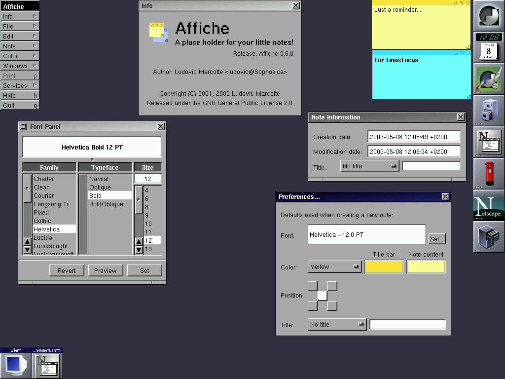 Wie die README Datei schon sagt, Affiche ist eine kleine Anwendung die es erlaubt, Notizen auf dem Desktop zu kleben. Mac OS X Nutzer werden sich an die "Stickies" Anwendung erinnert fühlen. Man kann sagen, es ist das Äquivalent zu "post-it Zetteln (Klebezetteln)" aber eben ohne Kleber.