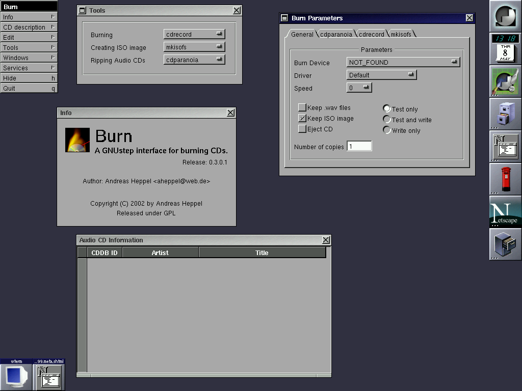 Wie der Name schon sagt, handelt es sich um ein CD Brennprogramm. Burn.app ist die Arbeit von Andreas Heppel und man findet es unter http://www.sourceforge.net/projects/gsburn. (gsburn ist der Name der vorherigen Version). Getestete Version ist 0.3.0.1.
