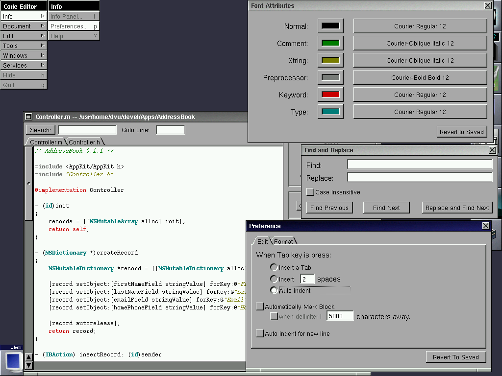 CodeEditor bietet Syntax Hervorhebung. Ein originelles und nützliches Feature sind die Tab Fenster. Dadurch kann man verschiedene Quelltexte im selben Fenster haben (z.B. *.m und *.h Dateien). Mittels der Werkzeugleiste kann man den Quelltext durchsuchen oder zu einer bestimmten Zeile gehen. Natürlich gibt es auch ein "Suchen und Ersetzen" Werkzeug, das reguläre Ausdrücke unterstützt.