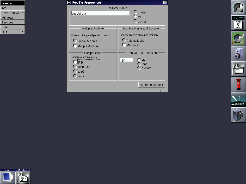 FreeTar arbeitet versteckt (das bedeutet, es bietet kein eigenes Fenster). Durch einen Rechtsklick mit der Maus auf sein Icon (entweder im Clip oder im Dock, wenn man Window Maker benutzt) erscheint ein Menü, mit dem man die zu archivierenden Dateien auswählen kann.