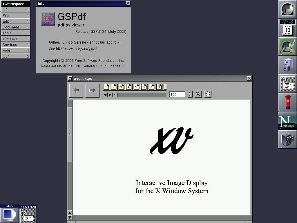 GSPdf ist die Arbeit von Enrico Sersale, dem GWorkspace Autor. Die Anwendung kann heruntergeladen werden von http://www.gnustep.it/enrico/gspdf/