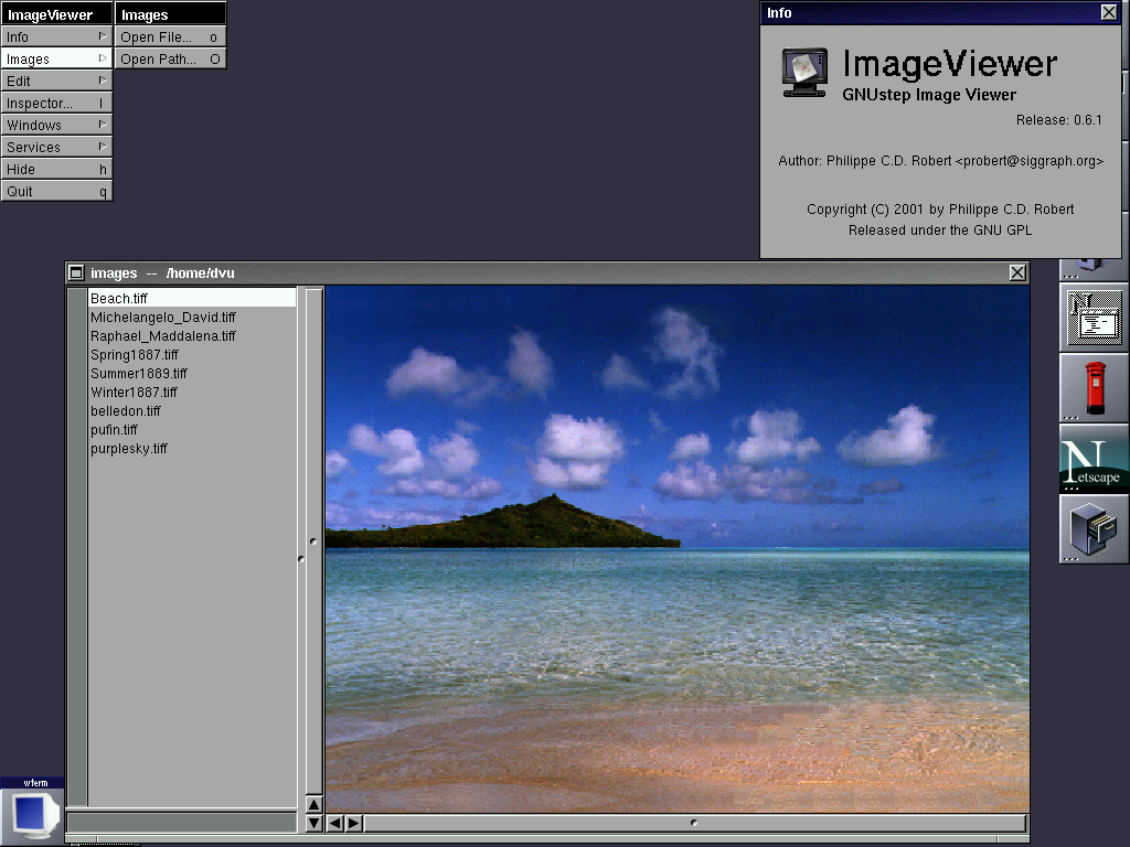 ImageViewer ist die Arbeit von Philippe C.D. Robert (mit Beiträgen von Pierre-Yves Rivaille und Rob Burns). Die für den Test genutzte Version ist 0.6.1. Philippe ist Autor von verschiedenen GNUstep Anwendungen, unter denen man z.B. das großartige ProjectCenter findet. ImageViewer kann man herunterladen von http://www.nice.ch/~phip/softcorner.html