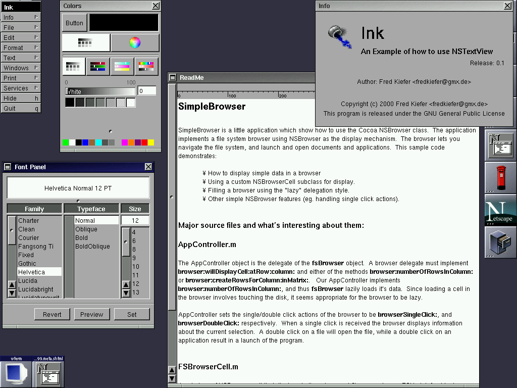 Man wird merken, dass viele der verfügbaren Anwendungen noch sehr "jung" sind und erst in Version 0.1 oder 0.2 vorliegen. Sie funktionieren aber! Die Versionsnummern bedeuten nicht, dass sie "unbrauchbar" sind, sondern es bedeutet nur, dass einige Features noch fehlen oder weiter verbessert werden müssen. Es sei noch gesagt, dass die Anwendungen sehr einfach nach Mac OS X portiert werden können und dass schon jetzt viele auf beiden Umgebungen laufen. Mit anderen Worten, mit GNUstep kann man Anwendungen für die meisten Betriebssysteme schreiben, egal ob sie unixartig sind oder nicht. Das bedeutet, dass man sie sogar zum Teil unter Windows ausführen kann, auch wenn das vielleicht etwas kompliziert ist. Kurz, GNUstep ist universell ;-)