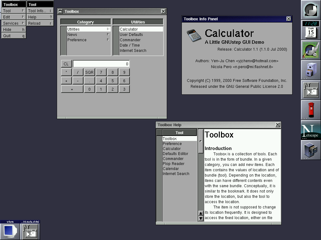 Toolbox ist... eine Sammlung von Werkzeugen. Es ist die Arbeit von Yen-Ju Chen mit Unterstützung von vielen anderen GNUstep Entwicklern für die verschiedenen Werkzeuge (GNUstep ist eine Familie). Man kann diese Anwendung herunterladen unter http://savannah.nongnu.org/projects/toolbox.