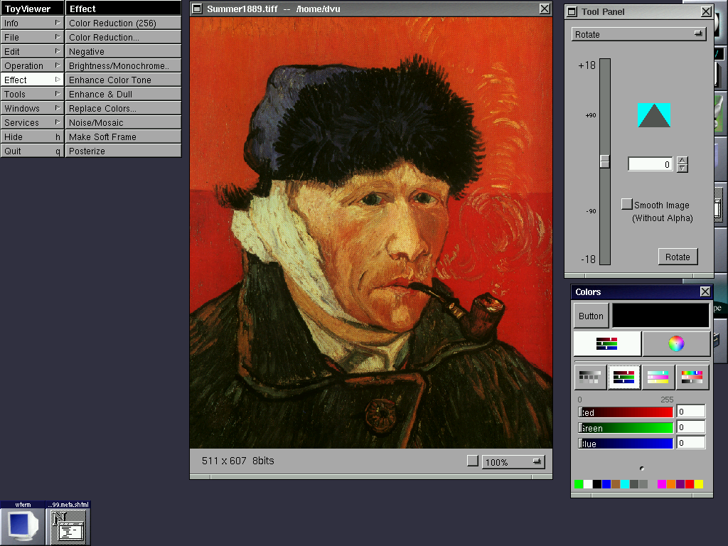 ToyView ist eine schon sehr alte Anwendung, die zum ersten Mal für NeXTstep und dann für OpenStep und Mac OS X durch Ogihara entwickelt wurde. Es ist ein Bildbearbeitungsprogramm. Dies hier ist die GNUstep Portierung durch Fabien Vallon und es ist Version 0.3. Es kann heruntergeladen werden von http://gnustep-apps.org/fabien/Toyviewer_Port/.