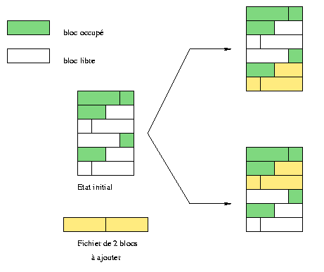 Par exemple, on peut envisager tout support physique de données (un disque dur par exemple) comme un suite de petites cases contenant des informations : on parle de blocs (blocks en Anglais). Chaque système de fichiers gère ces blocs différemment. Par exemple, dans la figure 1 , on cherche à insérer un fichier tenant sur 2 blocs. Dans l'illustration supérieure, le fichier a été placé après le dernier bloc occupé, laissant des espaces vides au début. A l'inverse, dans le schéma inférieur, il a été placé au premier endroit pouvant le contenir. Si le terme "fragmentation" vous évoque quelque chose, vous savez maintenant ce qu'il représente ;-)