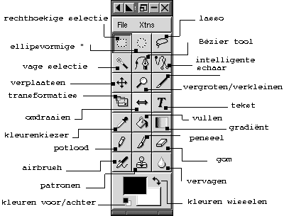 Deze toolbar (knoppenbalk) toont Gimp 1.0.4, een stabiele versie. Maar ik raad je zeker aan om een recente ontwikkelaars-versie te installeren, omdater er zoveel nieuwe functies in zitten. Bijvoorbeeld Gimp 1.1.9 gaf geen problemen op mijn systeem (RedHat 6.0), er zaten zes extra gereedschappen in, nieuwe functies voor het veer-gereedschap, een navigatiesysteem voor tijdens het zoomen, ...