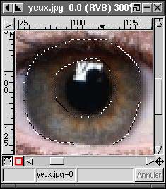 Maak eerst met de lasso een selectie de iris van het oog. Ook met de lasso verwijder je dan de zwarte pupil uit de selectie ("ctrl").