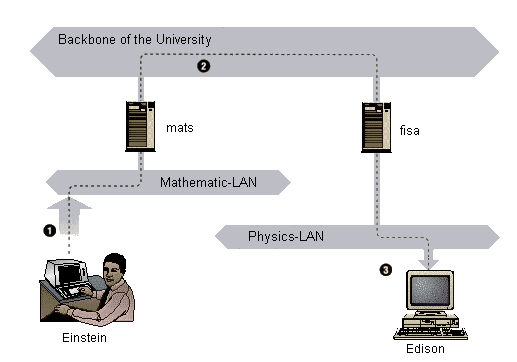 Omdat de software van Einstein (rlogin, telnet, ftp etc.) geen data (data pakketten) rechtstreeks naar Edison kan zenden, daar deze zich op een ander fysiek gescheiden netwerk bevindt, moet je gebruik maken van een gateway om de pakketjes naar de corresponderende bestemming te transporteren. Met andere woorden, de gateway "mats" stuurt de pakketjes naar de gateway "fisa", die dezelfde functie vervult in het physics netwerk. Het transport gaat over de backbone van de universiteit en "fisa" levert de data af bij Edison. Dit schema van gegevensoverdracht naar een remote host (computer op het netwerk) wordt Routing genoemd en de data pakketten heten in het Engels datagrams.