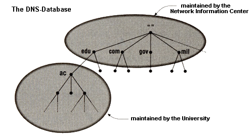 Het Network Information Center bijvoorbeeld, beheert het domein "edu" (educational) maar draagt het beheer over het subdomein "ac.edu" (academic) over aan de universiteit, die de mathematics afdeling de toestemming geeft om het volgende domein te beheren: "mathematics.ac.edu" (Figuur 3).