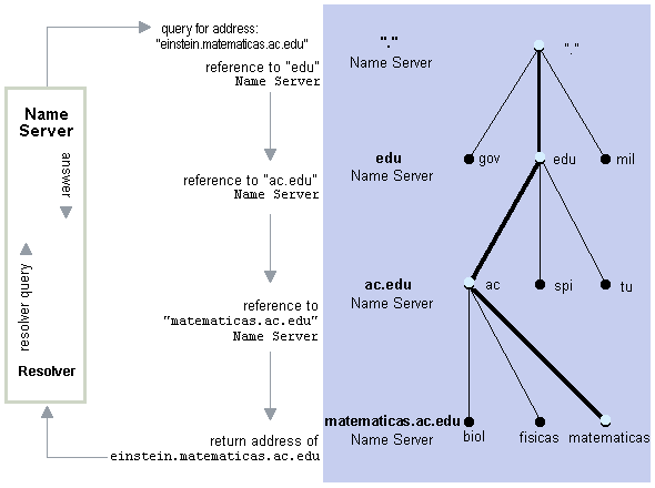 Computers, anderszijds, werken perfect met getallen zoals IP-adressen. Als je op het Internet op zoek gaat naar een adres zoals http://www.altavista.com, zal je browser een verzoek sturen naar de Domain Server van je provider om het corresponderende IP-adres bij deze domeinnaam te zoeken. Als je provider geen toegang heeft tot deze zone, stuurt deze het verzoek door naar het betreffende domein, en dit gaat zo door todat de aanvraag aankomt bij het laatste domein. De laaste domeinserver verstuurt dan het gevraagde IP adres naar de computer die het aangevraagd had. (Figuur 4 geeft een beeld van het zoekproces voor het adres "einstein.mathematics.ac.edu")