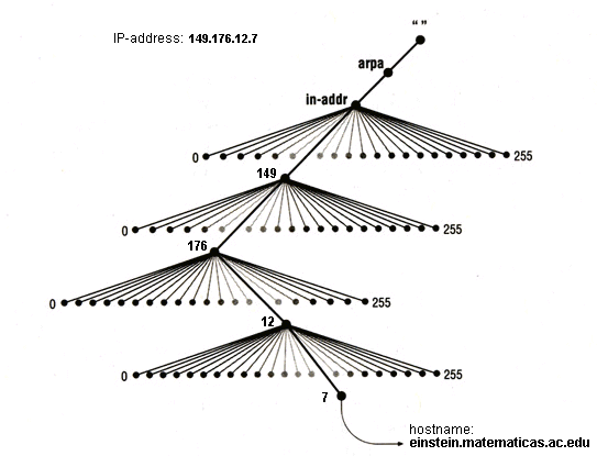 Bijvoorbeeld: Het IP-adres voor Einstein van het wiskundedepartement is "149.176.12.7" met de domeinnaam "einstein.mathematics.ac.edu".