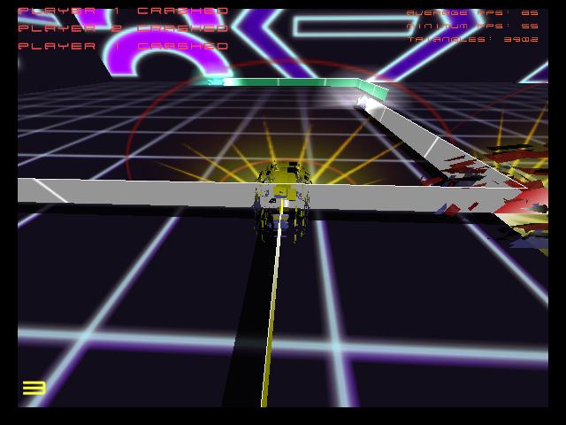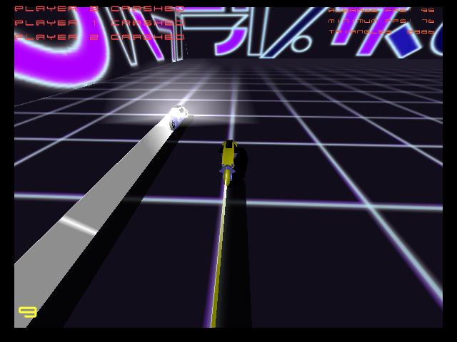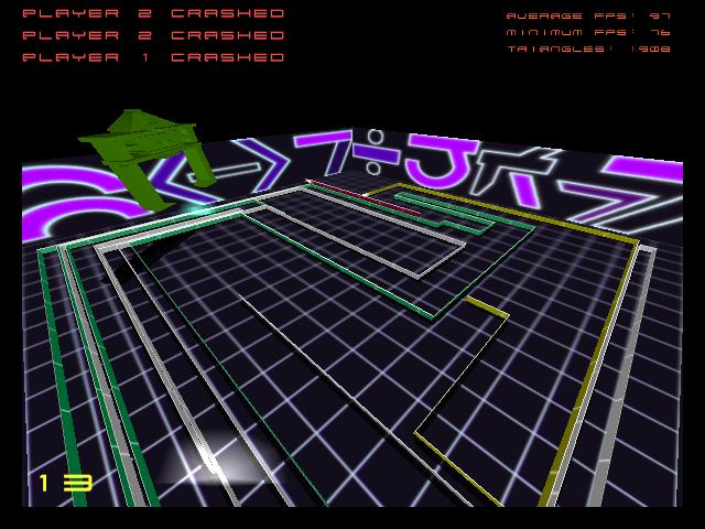 De game performance is ok. Zelfs in hogere resoluties is de game vrij snel (als je voor een hogere game speed hebt gekozen). Doordat de vloer een blauwe grid is met een zwarte ondergrond, zijn de schaduwen een beetje onduidelijk. Een semi-transparante of reflecterende floor zou er beter uit hebben gezien. De lichtmuren hebben geen wijdte en het is mogelijk (vooral in cockpit view mode) dat je tegen een muur aan rijdt wanneer je het spoor van je opponent volgt omdat je simpelweg deze niet hebt gezien. Bewegingen doen zich niet alleen voor op de lijnen van de grid. Er is ruimte tussen twee grid lijnen voor een licht muur. De zwarte achtergrond van de arena en de symbolen op de rijbaan creëeren een heus onechte atmosfeer. Echter, als je niet van deze instelling houdt kun je altijd je eigen graphics voor muren en de omgevinging creëeren en deze ook gebruiken!