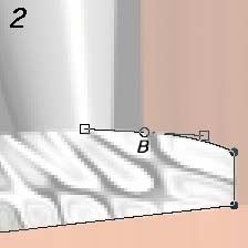Для того чтобы получить изображение 1 (в точке А), Вы должны просто щелкать левой кнопокой мыши от точки к точке, до тех пор пока не получится изображение 2. Затем, после установки точки В, переместите курсор влево не отпуская левую кнопку мыши. На экране отобразится кривая и ее касательные; когда кривая совпадет с объектом, отпустите кнопку мыши. Затем увеличьте длину касательных, передвинув маленький квадратик, так чтобы кривая не изменила свою форму. Удерживая клавишу "shift", можно передвигать только левую касательную. Ее нам надо расположить вертикально, по направлению к следующей точке... Когда Вы расставите все точки и замкнёте кривую, можно нажав кнопкой мыши на изображении выделить его.