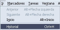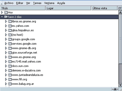 El historial es una base de datos con las páginas que hemos visitado, ya sea en esta sesión o en cualquier otra. Mozilla, por defecto, sólo guarda las páginas visitadas los últimos 9 días, aunque esto es modificable a partir de la barra de menús en Editar >> Preferencias >> Historial. El historial puede usarse para acceder a una página que hemos visitado y a la que no hemos añadido un marcador. Sólo tendremos que abrir el historial: en la barra de menús, seleccionamos Ir >> Historial, escogemos el día en que visitamos la página y allí elegimos la página de la lista.