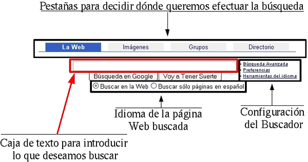 2. En la parte superior aparecen unas pestañas donde especificaremos si deseamos realizar la búsqueda en páginas web (activada por defecto), si deseamos buscar imágenes, en los grupos de noticias (los veremos posteriormente) o en el Directorio (que es una organización estructurada por temas de páginas web que mantiene Google).