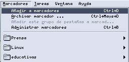 La opción Administrar marcadores nos permite modificar la estructura de nuestros marcadores: crear y borrar carpetas, introducir separadores, mover marcadores de carpeta y eliminar marcadores. |