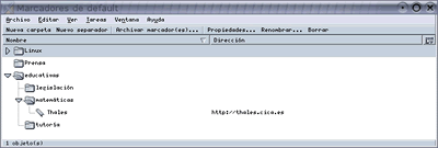 Este ha sido un primer acercamiento al uso de los marcadores, pero no es el más adecuado, pues no nos permite decidir en qué carpeta almacenar el marcador ni darle un nombre que nos permita recordar el contenido de la página. Vamos, por ejemplo, a almacenar la página de la asociación matemática Thales en una carpeta (ya veremos cómo se crean) llamada matemáticas. Para poder hacerlo debemos proceder de la siguiente manera: