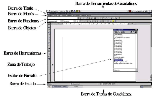 Bien, como decíamos, el entorno no asusta mucho a quien esté acostumbrado/a a trabajar en un procesador de textos cualquiera. Podríamos realizar un pequeño análisis inicial de los componentes que aparecen en la pantalla: la barra de menús, la barra de funciones, la zona de trabajo, herramientas, barra de tareas del sistema operativo,... Eso sí, para nuestra comodidad, vamos a cerrar la ventana Estilos De Párrafo puesto que no la vamos a necesitar.