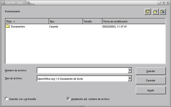 Ya sabemos cómo funciona el sistema de carpetas en GuadaLinex. Como es lógico, la carpeta destinada por defecto a guardar el archivo es la nuestra (usuario aparece en la figura porque este es el nombre con el que hemos entrado en el sistema), pero podemos indicar otra subcarpeta de esta haciendo doble click sobre ella, crear una nueva con , subir un nivel utilizando el botón o intentar alojar el fichero en otra cualquiera (siempre que tengamos permiso de escritura sobre ella, porque ya sabéis que Linux es intransigente con esto de los permisos). Estas opciones se aprecian en la figura anterior o podemos pasear el ratón por la ventana para que los cuadros de ayuda que se abren nos informen. Algo que es mejor no olvidar, obviamente, es el nombre del fichero. Para ello hay que rellenar el campo destinado a ese fin y que aparece como Nombre de Archivo (cuidado con minúsculas y mayúsculas), que podría ser, por ejemplo, PrimerDocumentoWriter. Por último, queremos hacer referencia al menú desplegable Tipo de Archivo porque aquí podemos indicar al programa si queremos guardar este fichero como si fuera un archivo de Writer (extensión .sxw) o, por ejemplo, un archivo de MS Word, con extensión .doc (si trabajamos con este último procesador de textos, esta opción puede sernos de ayuda hasta que tengamos cierta soltura con el Writer). Observemos que también el programa nos permite guardar el archivo con una contraseña, aunque eso lo dejaremos para otro momento. Finalmente, sólo tenemos que hacer click en la opción Guardar.