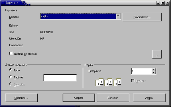 Es también fácil. Hay que acceder a Archivo->Imprimir, con lo que se abre la ventana siguiente y en ella marcaremos las opciones principales, que son: una impresora (si hay varias conectadas en la red elegimos una), el área de impresión (todo el documento, unas páginas concretas o una zona previamente seleccionada) y el número de copias que queremos. Después pinchamos en Aceptar y ya está.