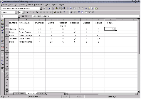 Otro aspecto fundamental en las hojas de cálculo es la utilización de fórmulas, habitualmente matemáticas (pero no necesariamente). Nosotros, por ejemplo, realizaremos algunos cálculos con las calificaciones de las dos evaluaciones. Vamos a proponer un ejemplo sencillo, que podría ser mucho más rico asignando determinados porcentajes a cada nota; pero supongamos que nos basta con calcular la media aritmética de los datos que aparecen. Para realizar esta operación con Calc seguimos estos pasos: